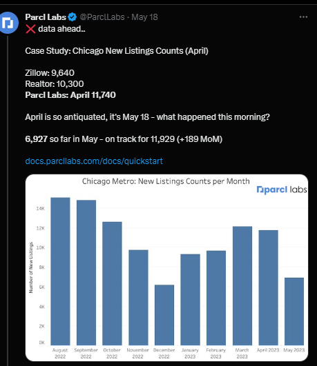 So, we have spec homes that are not listed on the listing sites. Now, let’s add the existing homes which are not listed. On the Century Village website there are over 100 homes listed for sale and rent. On Realtor.com there are only sixteen listed for sale. I have talked many months about the fact that many people don’t want to list on MLS and do end-runs with Facebook posts, local websites, etc. So, when the talking heads on Twitter (and no, I won’t be calling it X), say there is no inventory they do not realize that the data upon which they rely only has about 60% of the listings based on the conversations I have had with these data providers. And, I have been digging in after getting back from the road in February. I also believe the builders are strategic with listing one on Zillow, one on Realtor and one on Redfin versus listing them all. Parcl Labs, whose mission is to “index every property on the planet” is doing incredible work to solve this issue by collating these different sites as well as linking to county records and other sources. I think they are getting close to truly being able to track inventory like it’s 2023.