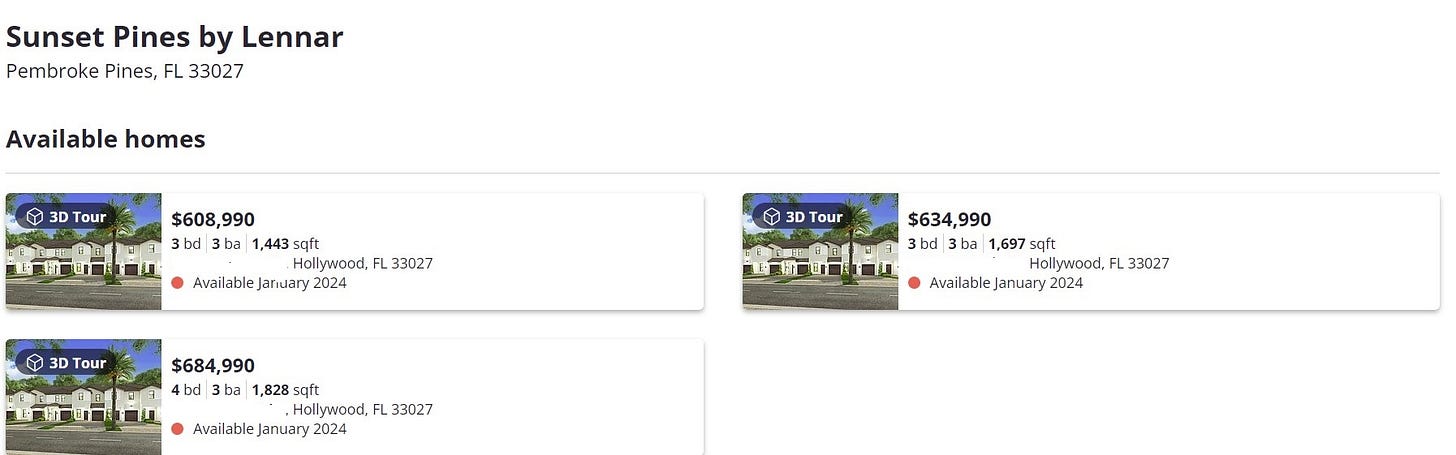 Most of the homes in Century Village are two-bedrooms, but if we do cost per square foot, we can see the difference. The ones in Century Village are between $200-$322 per square foot (including that one for $450K). The new Lennar homes just a couple of miles away that do not include any of the amenities at Century Village are going for between $374-$422 per square foot. More importantly the refrain from the video interviews of the residents of Century Village is that they would be listing their homes for sale or had already done so as they simply could not afford a cost increase on a fixed income. So, who exactly will be buying these lovely little spec homes?