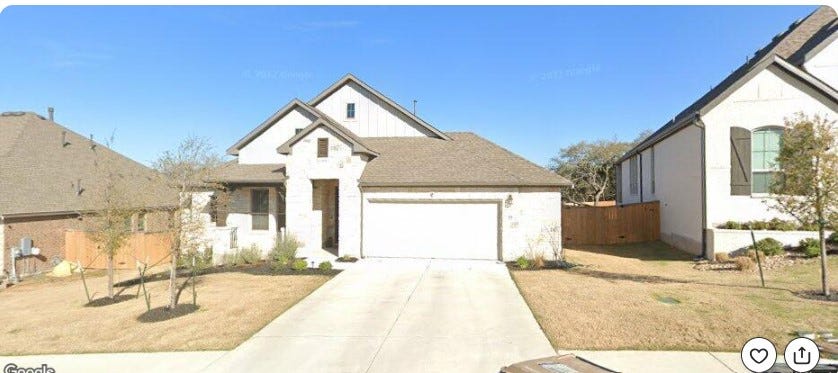 The borrower mentioned above bought this little jewel, 22 annoying miles south of Austin, in a subdivision full of the same thing for $585K: