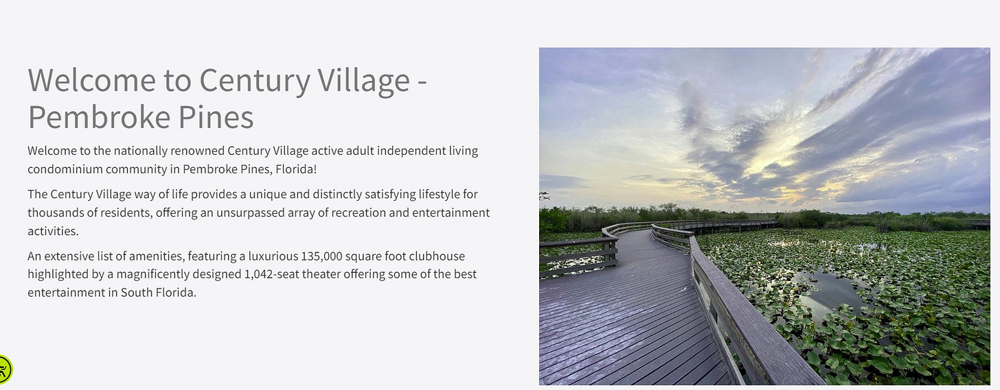 Century Village is a modest community with apartment homes listed between $179K-$350K (one delusional listing for $450K) and rentals for $1,500-$2,800.