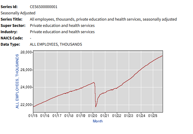 Since February 2020, prior to the lockdown, nonfarm payrolls have increased from 152,292,000 to 159,552,000 or by 4.77%. Education and Health Services on the other hand has increased by 12.41% from 24,573,000 to 27,623,000. The only other category to see double-digit gains is Transportation and Warehousing. Think of all those Amazon deliveries you received during Covid. However, that category peaked in February 2025 and is now down -1.16% from the peak while jobs in Education and Health Services have increased by 2.09% during the same time period.