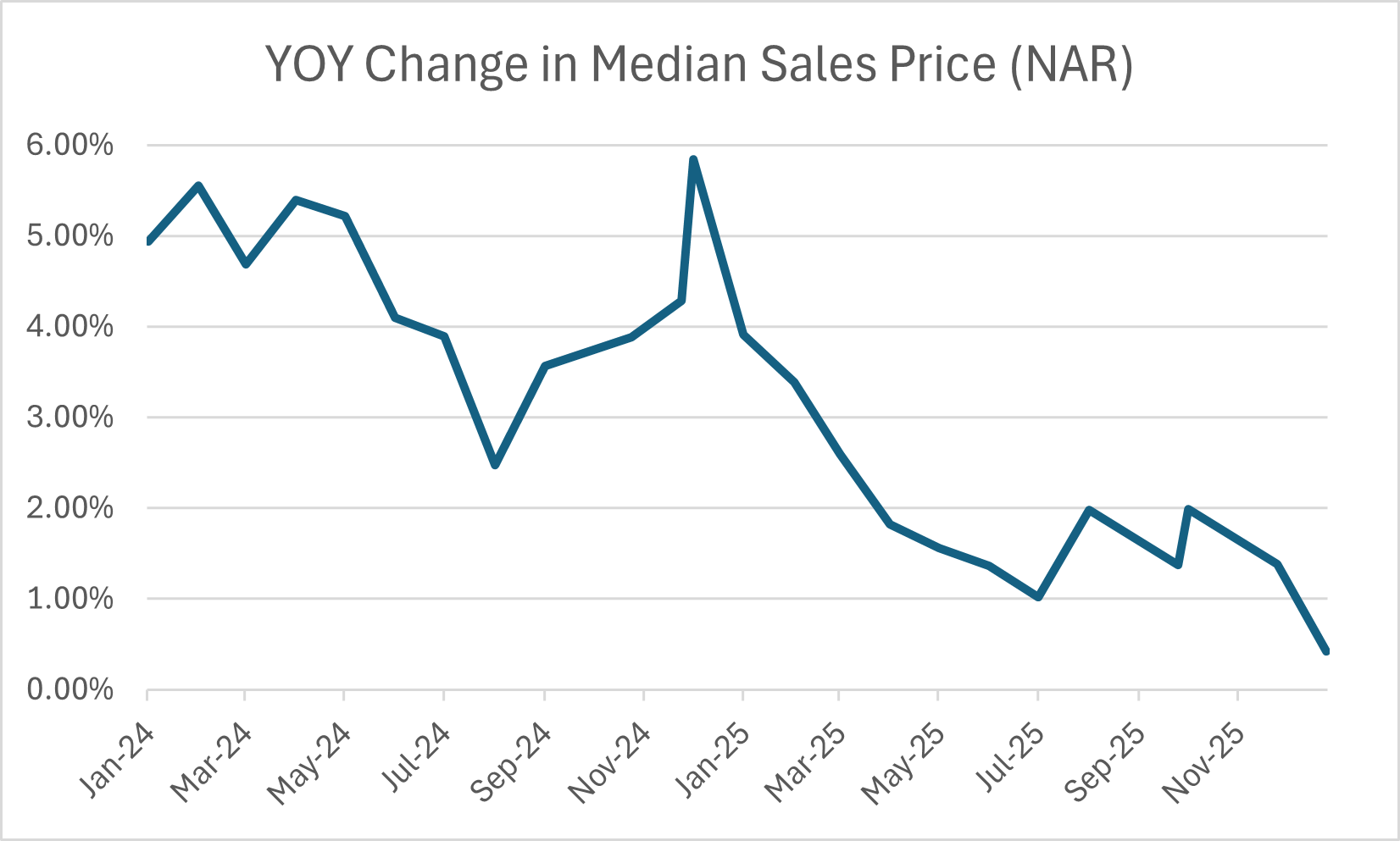 The 0.42% YOY increase in the median sales price reported in December is markedly lower than the 5.85% YOY increase we saw in December of 2024.