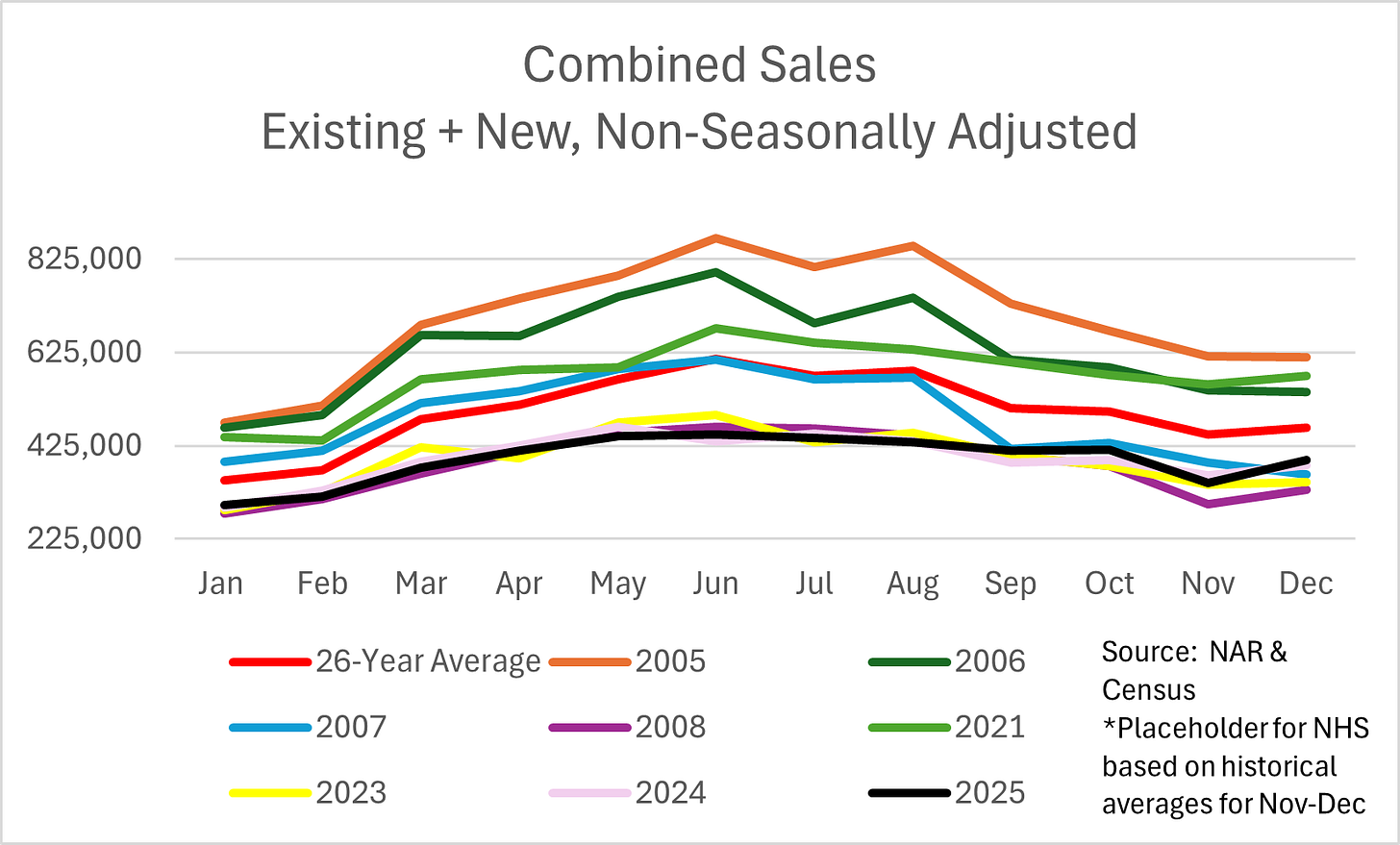 The information thus far published in December is full of clues about what we can expect in 2026, and the path housing will take. So far this month we have received December Existing Home Sales and New Home Sales data for September and October. Although we are still missing two months of new home sales data, it’s safe to say that 2025, from a combined sales (new + existing) perspective, will likely be lower than any year besides 2008, 2009, 2010 and 2011.